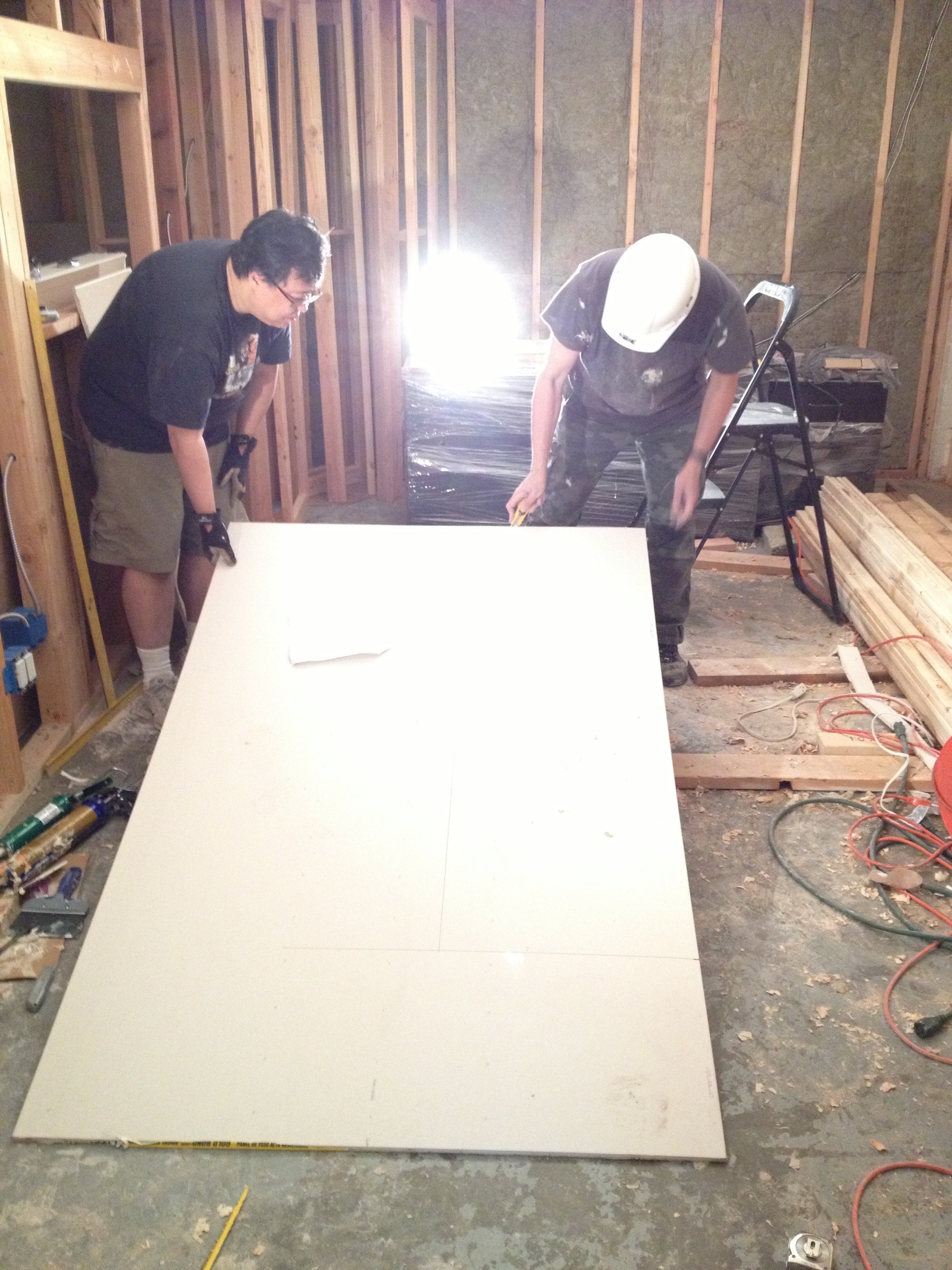 天井の梁が平らになったところで、やっと残りのドライウォール貼りに取りかかれます。