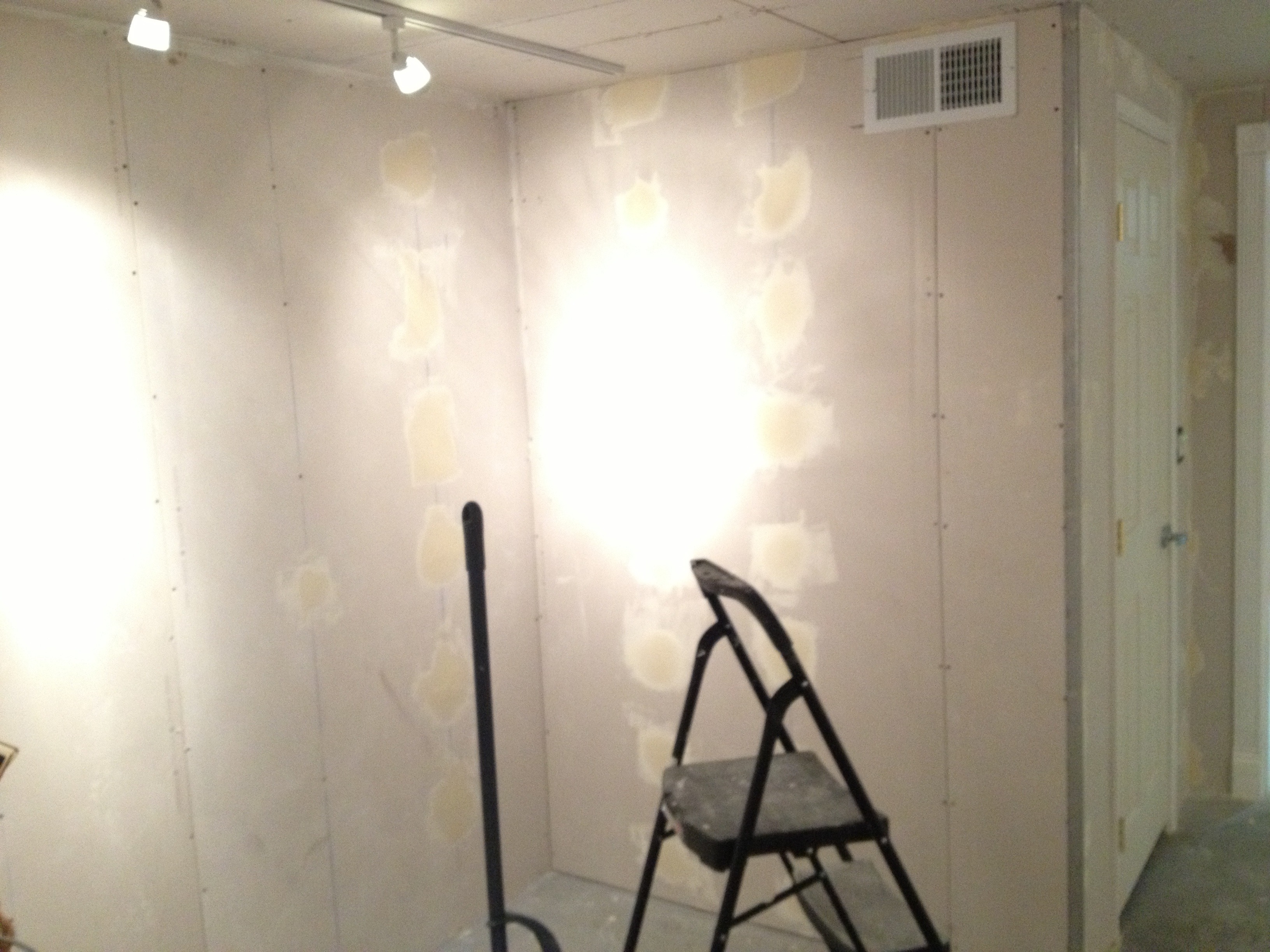 ドライウォールを固定するネジ穴の上にマッドを塗りたくってからヘラで奇麗に整える、そんな作業です。