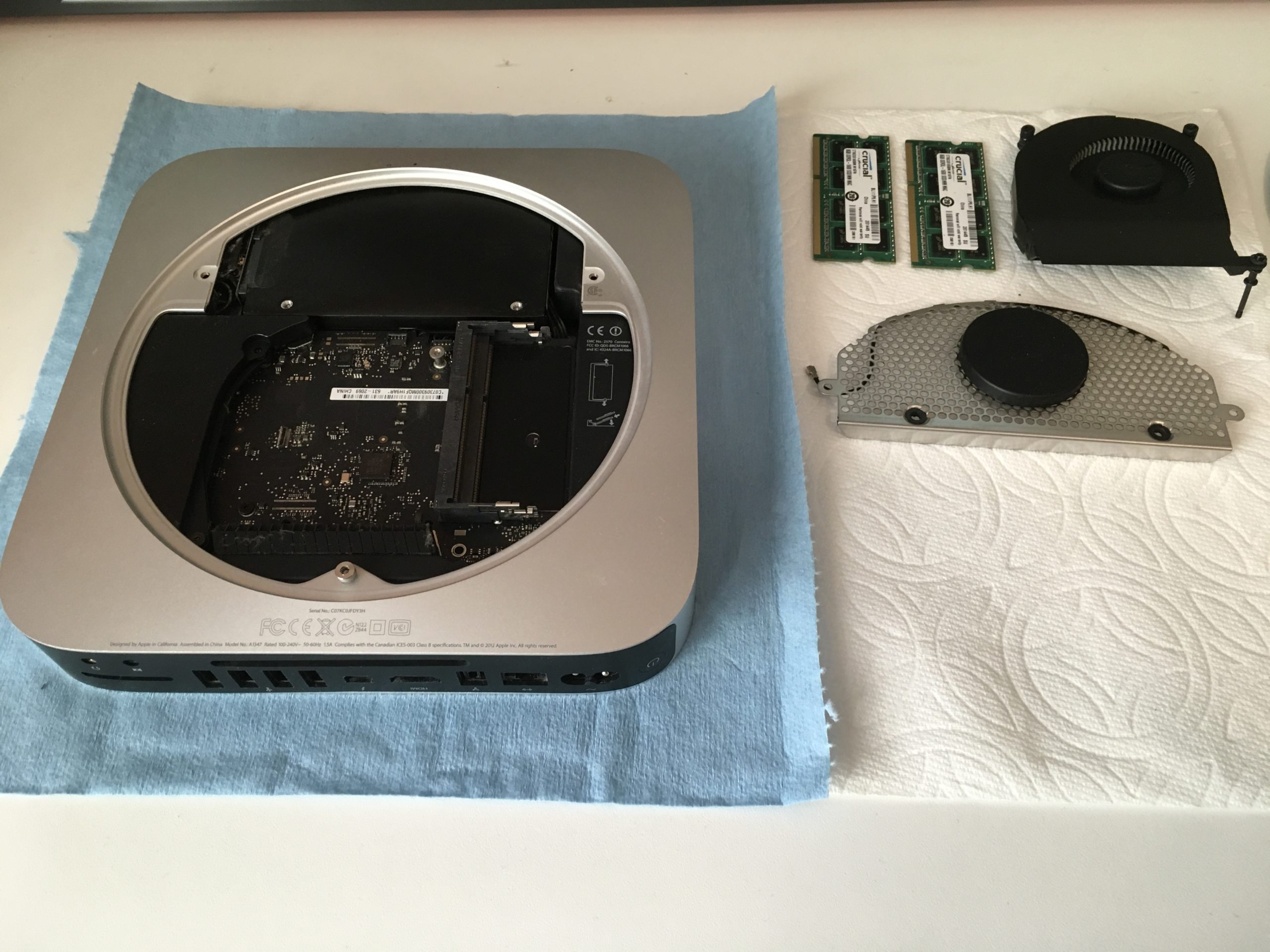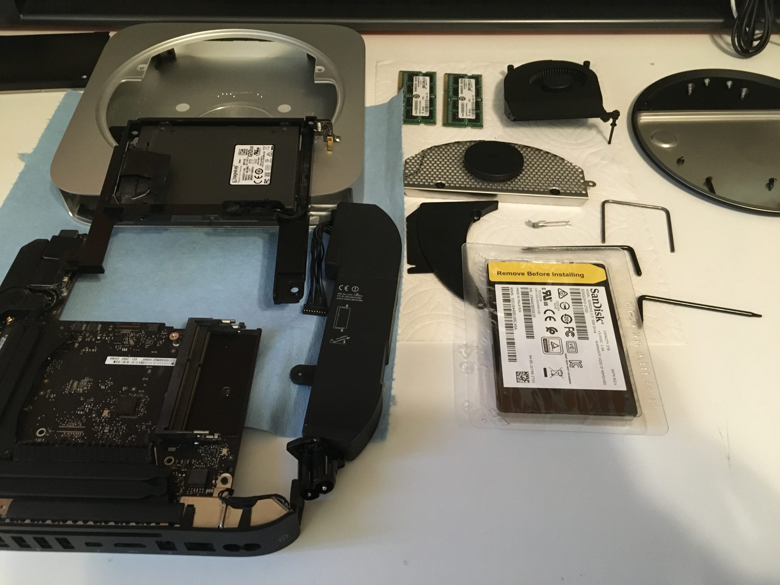 (細かい配線などもありますので、ご自身で作業される場合は事前にネットで具体的な手順を検索されてください。このようなサイトが参考になると思います。https://popo-design.net/macmini2014-ssd-exchange/)